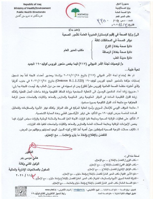 وقالت الوزارة في بيان ، إنه"تم عقد اجتماع لجنة الأمر الديواني (217) بعد تسجيل إصابات مؤكدة بالمتحور الجديد في جنوب أفريقيا والذي اعتبرته منظمة الصحة العالمية (فيروس مثير للقلق) ومن ثم تسجيله في عدد من دول العالم".