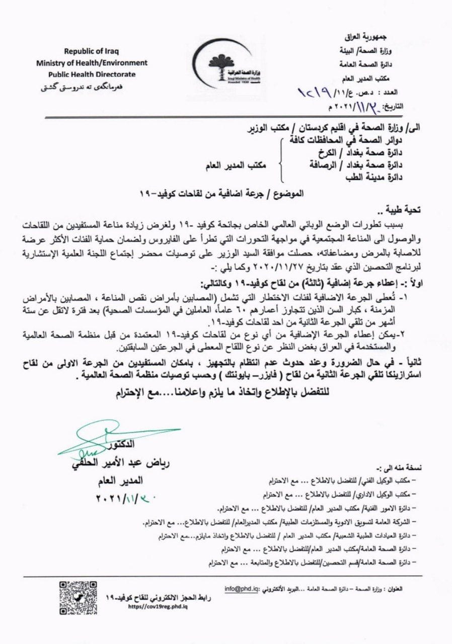 وقالت الوزارة في بيان انه "بسبب تطورات الوضع الوبائي العالمي الخاص بجائحة كوفيد -١٩ ولغرض زيادة مناعة المستفيدين من اللقاحات والوصول الى المناعة المجتمعية في مواجهة التحورات التي تطرأ على الفايروس ولضمان حماية الفئات الأكثر عرضة للاصابة بالمرض ومضاعفاته، حصلت موافقة الوزير على توصيات محضر إجتماع اللجنة العلمية الإستشارية لبرنامج التحصين الذي عقد بتاريخ ۲۰۲۰/۱۱/۲۷ وكما يلي :