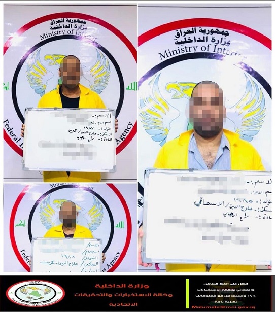 وقالت خلية الإعلام الأمني في بيان ان "وكالة الاستخبارات والتحقيقات الاتحادية في وزارة الداخلية تواصل عملياتها الاستباقية لتجفيف منابع الارهاب، حيث تمكنت من القاء القبض على ثلاثة ارهابيين في محافظة صلاح الدين مطلوبين وفق احكام المادة (٤/ارهاب)،