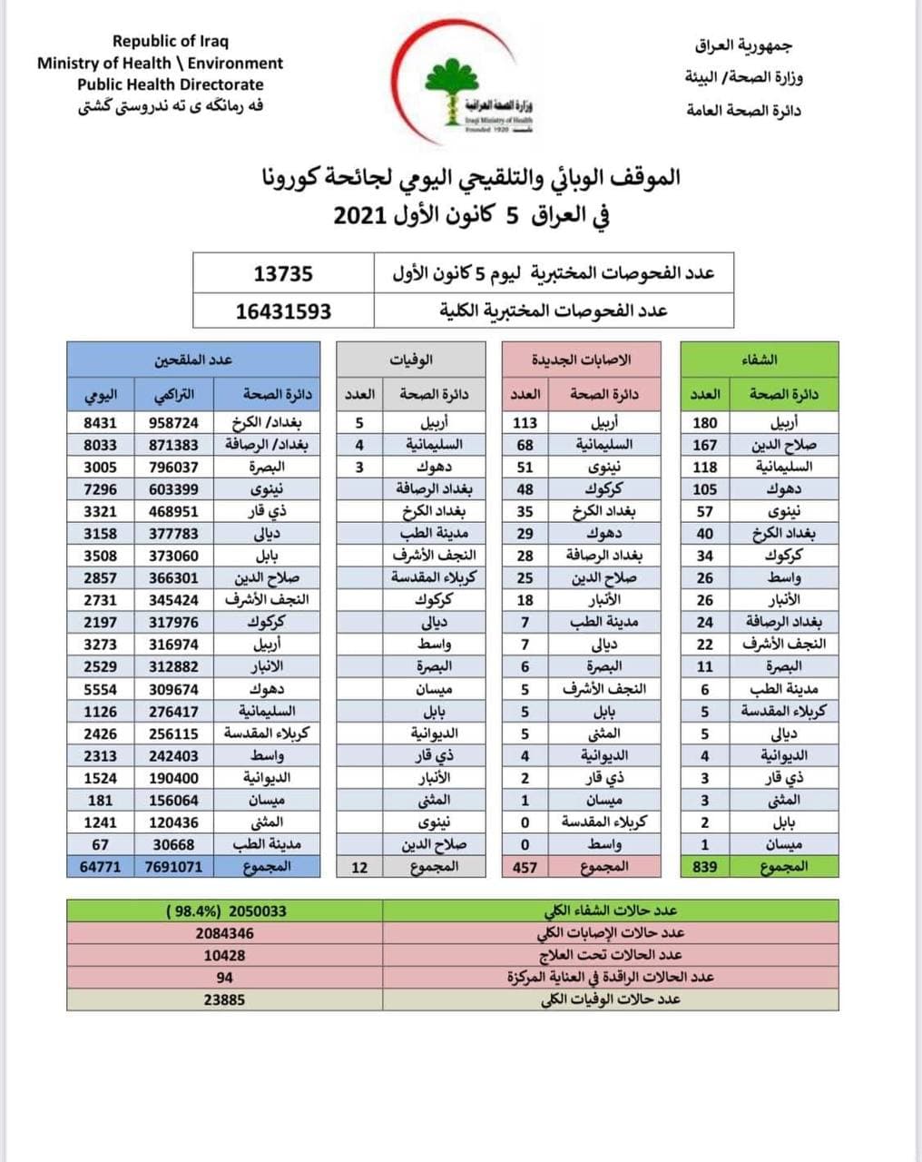 أعلنت وزارة الصحة، اليوم الأحد، الموقف الوبائي اليومي لجائحة كورونا في عموم العراق.