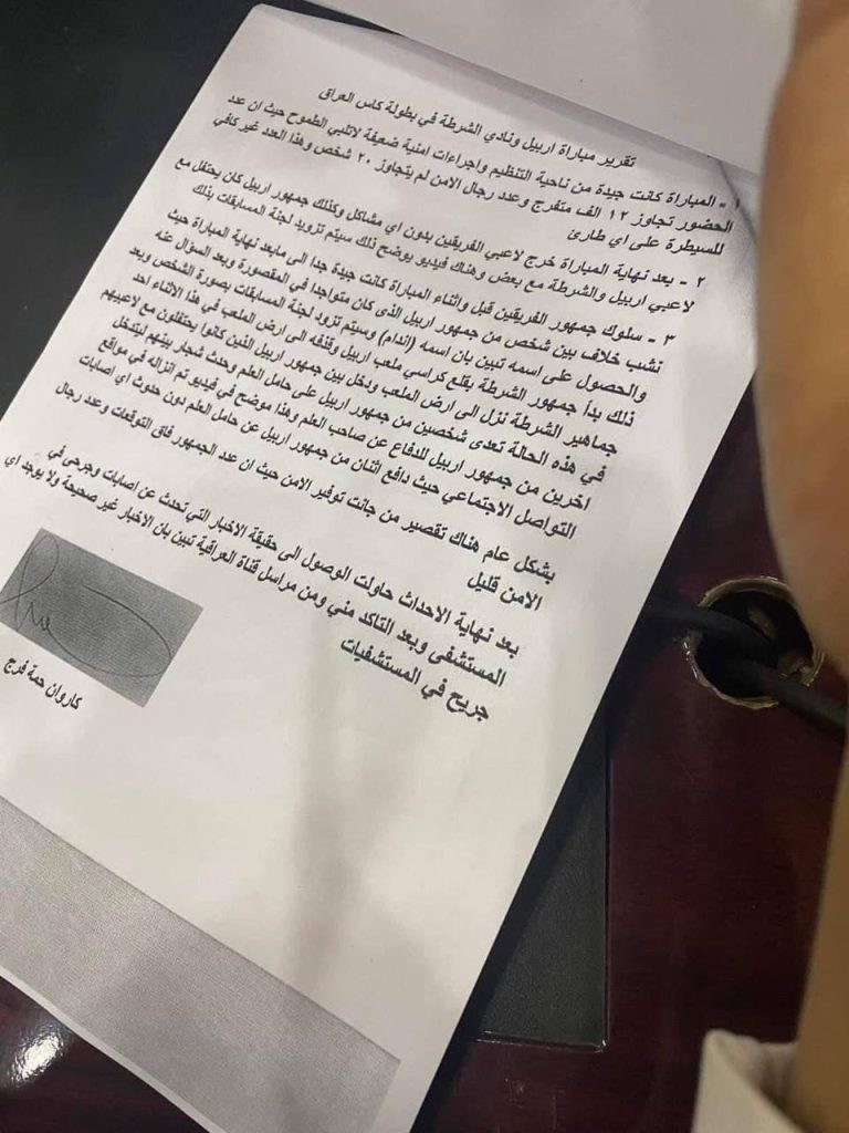 بالوثيقة … تقرير مشرف مباراة أربيل والشرطة