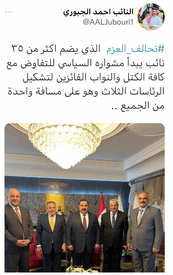 وقال الجبوري في تغريدة على "تويتر" ، ان "تحالف عزم الذي يضم اكثر من 35 نائبا يبدأ مشواره السياسي للتفاوض مع كافة الكتل والنواب الفائزين من اجل تشكيل الرئاسات الثلاث".