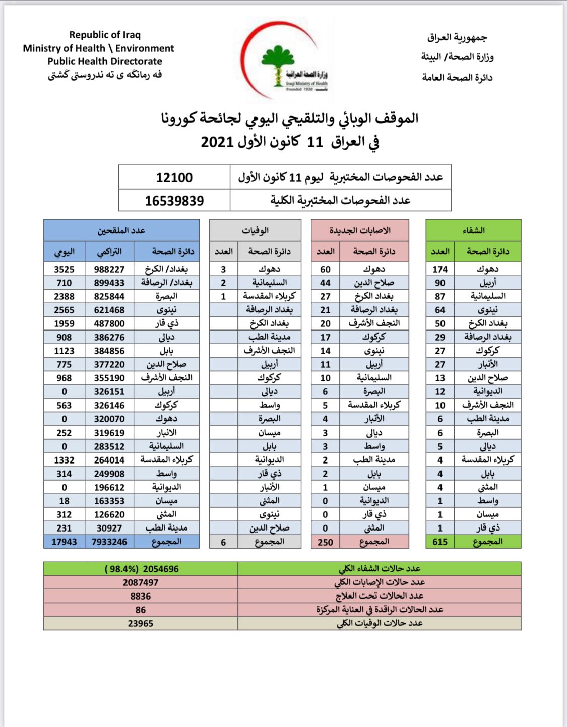 أعلنت وزارة الصحة، اليوم السبت، الموقف الوبائي اليومي لجائحة كورونا في عموم العراق.