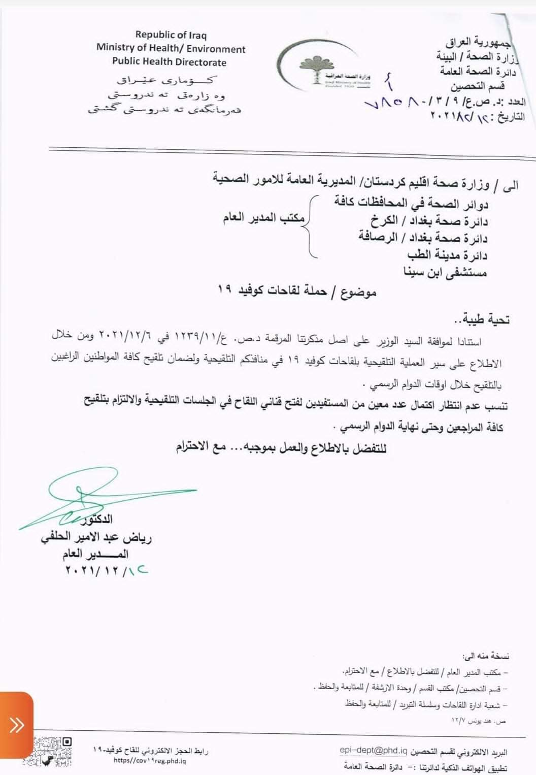 أكدت وزارة الصحة، اليوم الأحد، على تلقيح المواطنين دون الحاجة لاكتمال العدد المطلوب لفتح قناني لقاح كوفيد19.