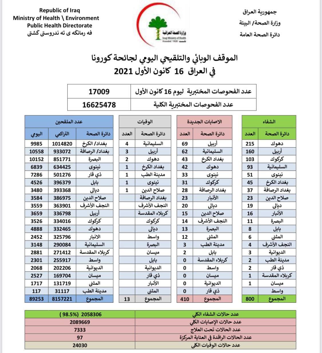 وأضاف البيان، أن "حالات الوفاة الجديدة بكورونا بلغت 13 حالة في عموم محافظات البلاد"، لافتا إلى أن "الاشخاص الذين تلقوا اللقاح خلال 24 ساعة بلغ عددهم 89253".