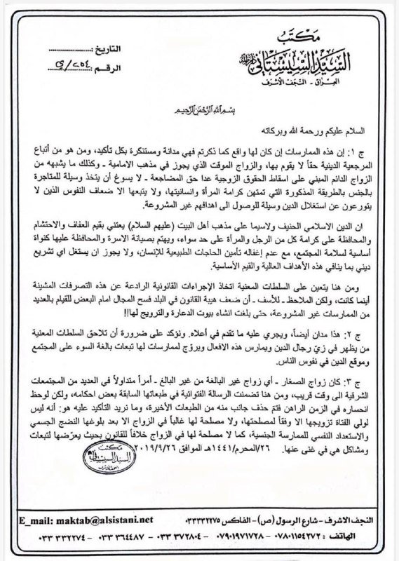 وجاء في عدد من الأسئلة بخصوص تزويج القاصرات ورأي المرجعية العليا في ذلك، ونصها: لدينا تسجيلات مصورة لرجال دين يقدمون نصائح دينية تفيد شرعية عقد زيجات مع اطفال دون السن القانوني في العراق وهو 15 عاماً، بعض رجال الدين هؤلاء يشيرون الى فتيات صغيرات جداً، كما أنهم يحددون الممارسات الجنسية التي يقولون أنها شرعية، هل يدين مكتب سماحة السيد نصائح كهذه من رجال الدين؟