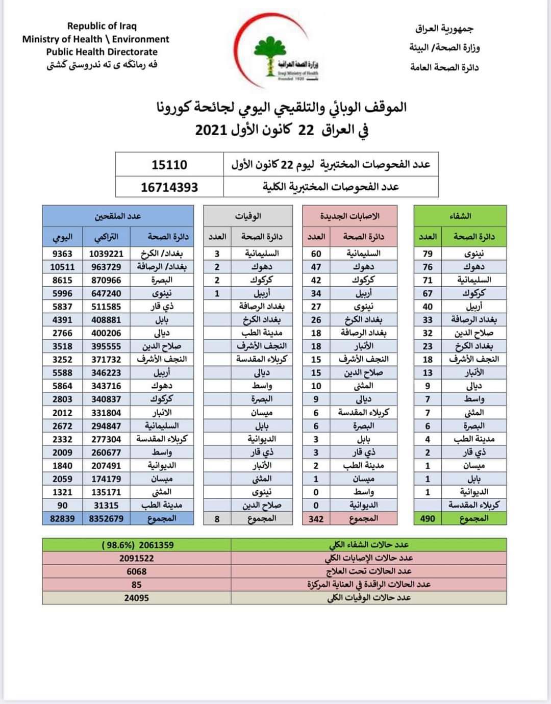 وأضاف البيان أن "حالات الوفاة الجديدة بكورونا بلغت 8 حالة في عموم محافظات البلاد"، لافتا إلى أن "الاشخاص الذين تلقوا اللقاح خلال الـ24 ساعة الماضية بلغ عددهم 82839".
