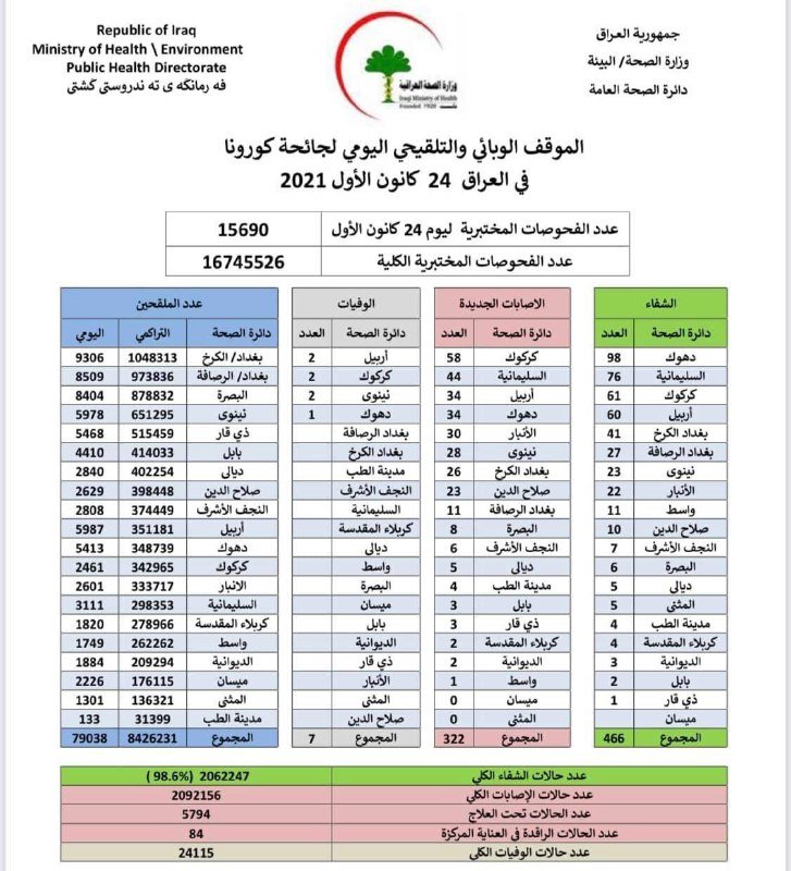 وذكرت الوزارة، في بيان ان "كوادرها سجلت 322 إصابة جديدة بفيروس كورونا، وتماثل 466 شخصا للشفاء".