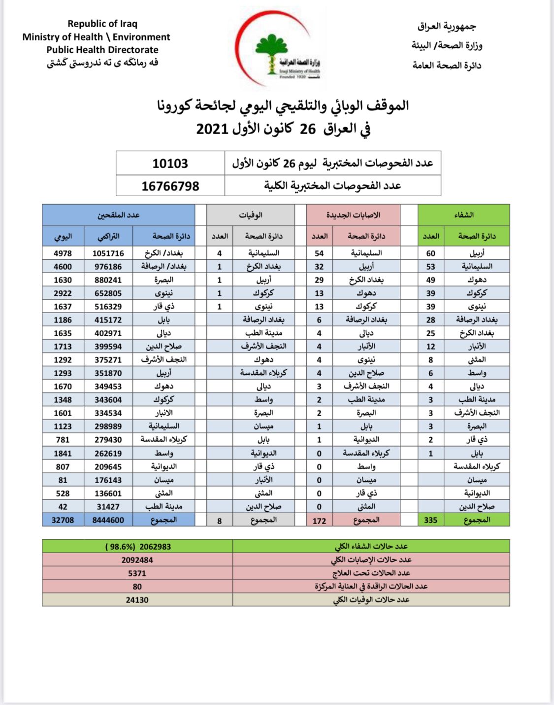 أعلنت وزارة الصحة، اليوم الأحد، الموقف الوبائي اليومي لجائحة كورونا في عموم العراق.