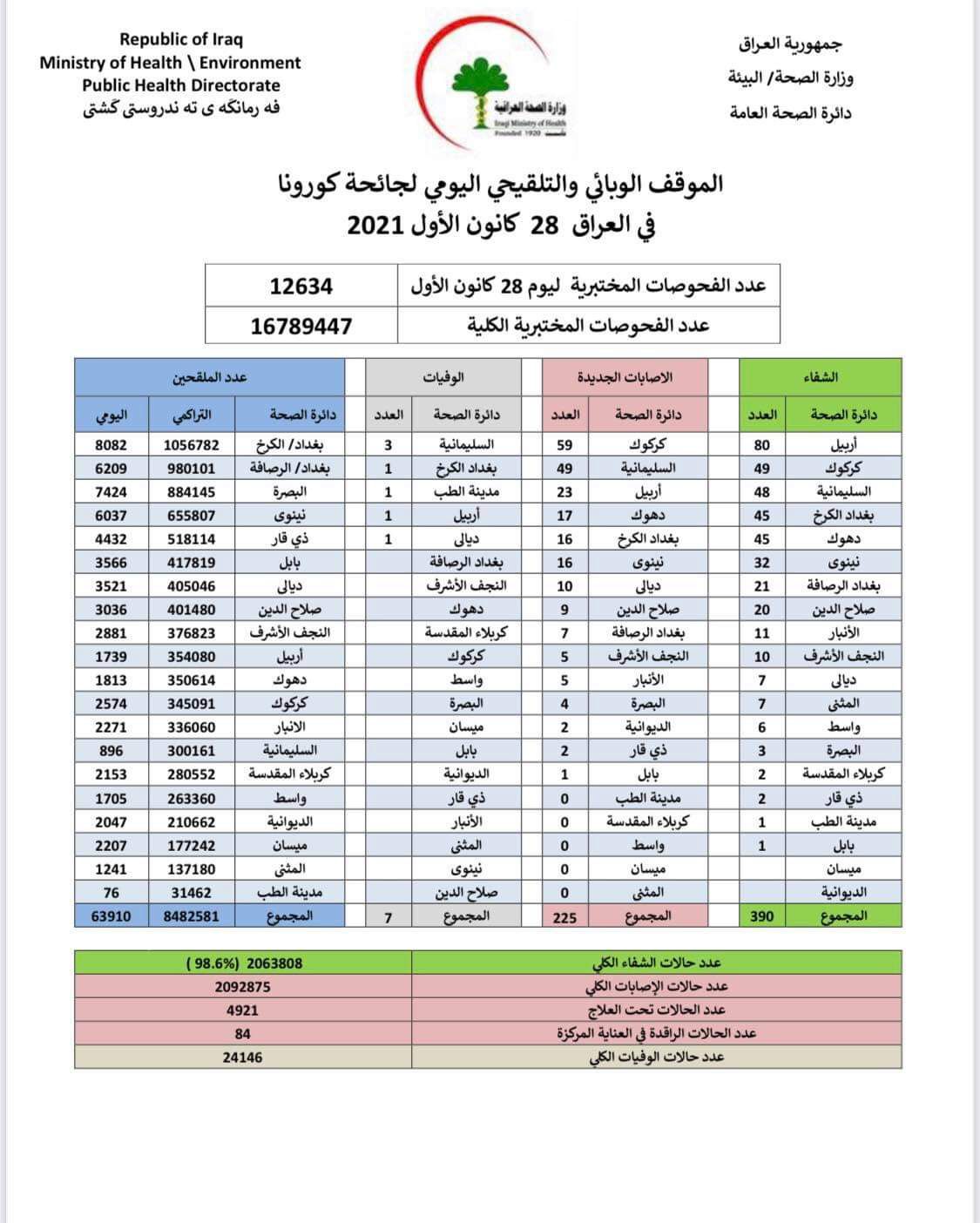 وقالت الوزارة في بيان ، إنها "سجلت 225 إصابة جديدة بالفيروس، و 390 حالة شفاء، مع 7 حالات وفاة بالفيروس".