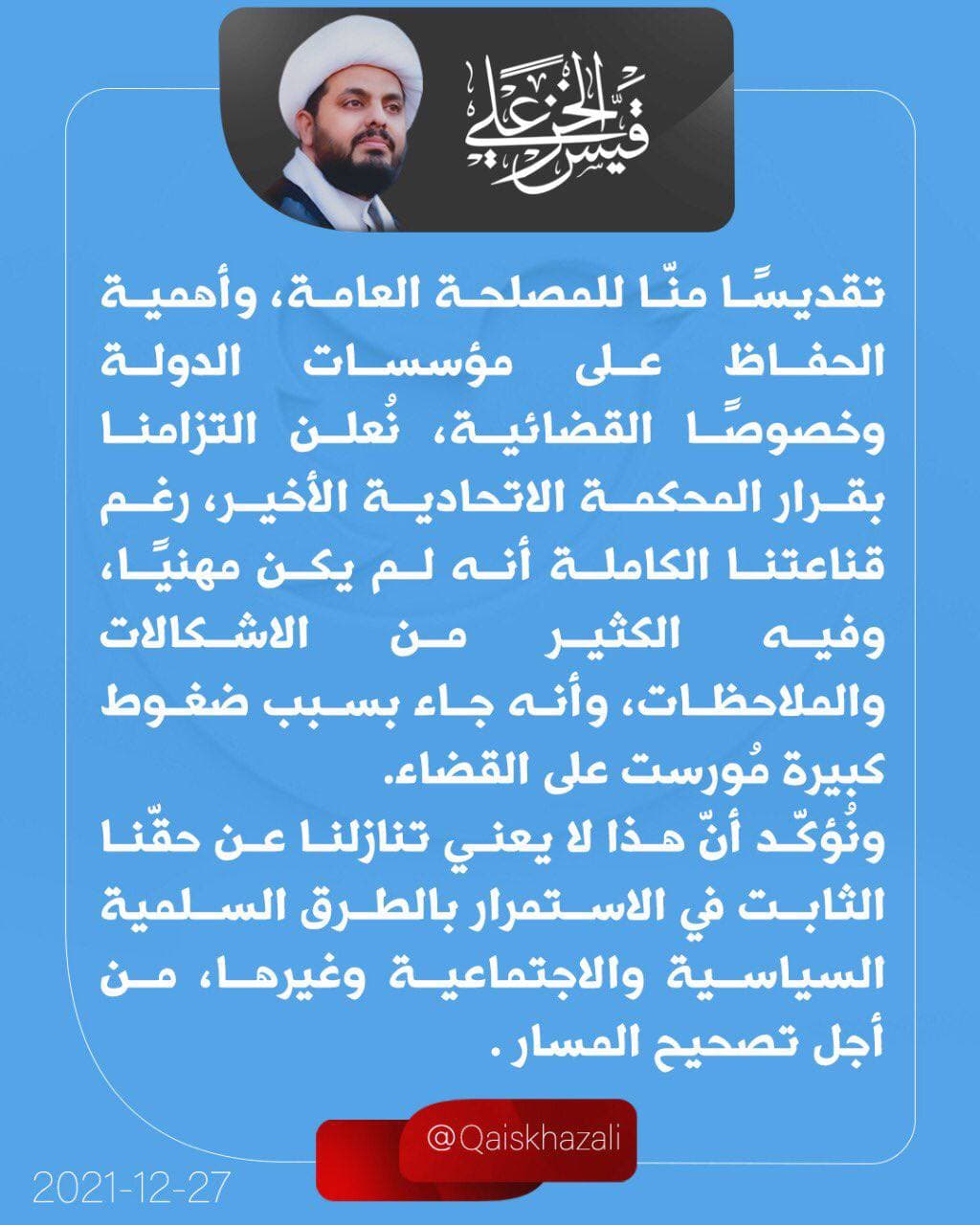 في تغريدة له … الشيخ قيس الخزعلي يؤكد الاستمرار بالطرق السلمية للحصول على الحقوق