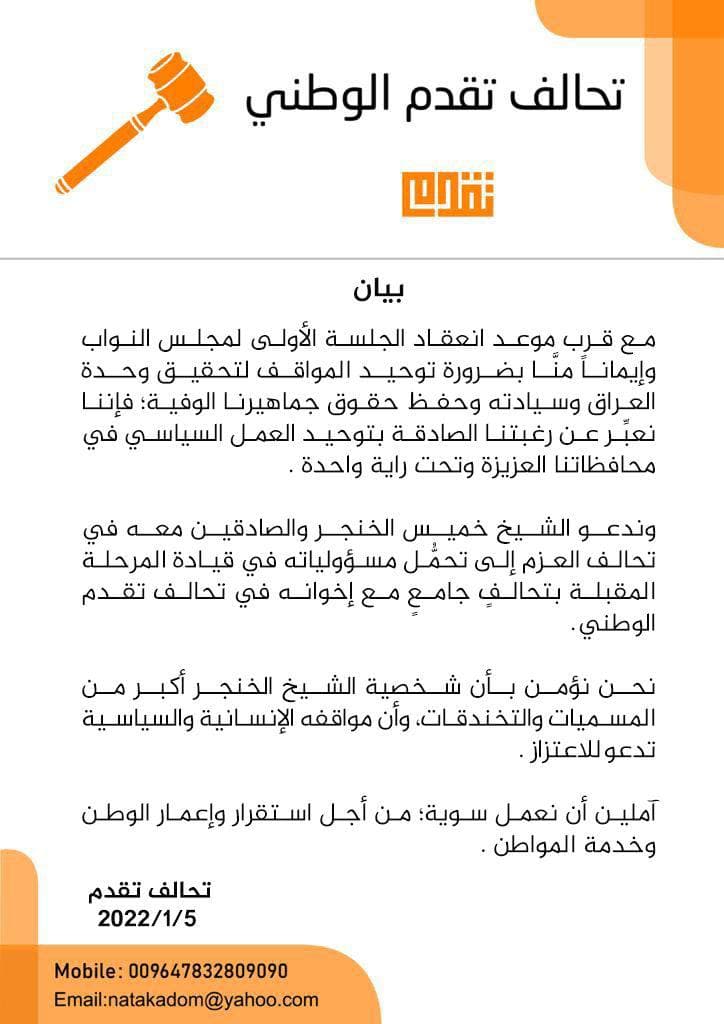 وقال تقدم في بيان له، إنه "مع قرب موعد انعقاد الجلسة الأولى لمجلس النواب وايمانا منا بضرورة توحيد المواقف لتحقيق وحدة العراق وسيادته وحفظ حقوق جماهيرنا الوفية؛ فأننا نعبر عن رغبتنا الصادقة لتوحيد العمل السياسي في محافظاتنا العزيزة وتحت راية واحدة".