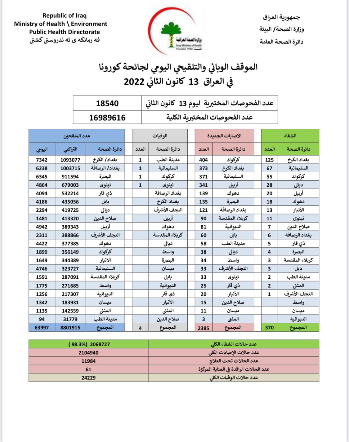وأضاف البيان، أن "حالات الوفاة الجديدة بكورونا بلغت 4 حالات في عموم محافظات البلاد"، لافتا إلى أن "الاشخاص الذين تلقوا اللقاح خلال 24 ساعة بلغ عددهم 63997".