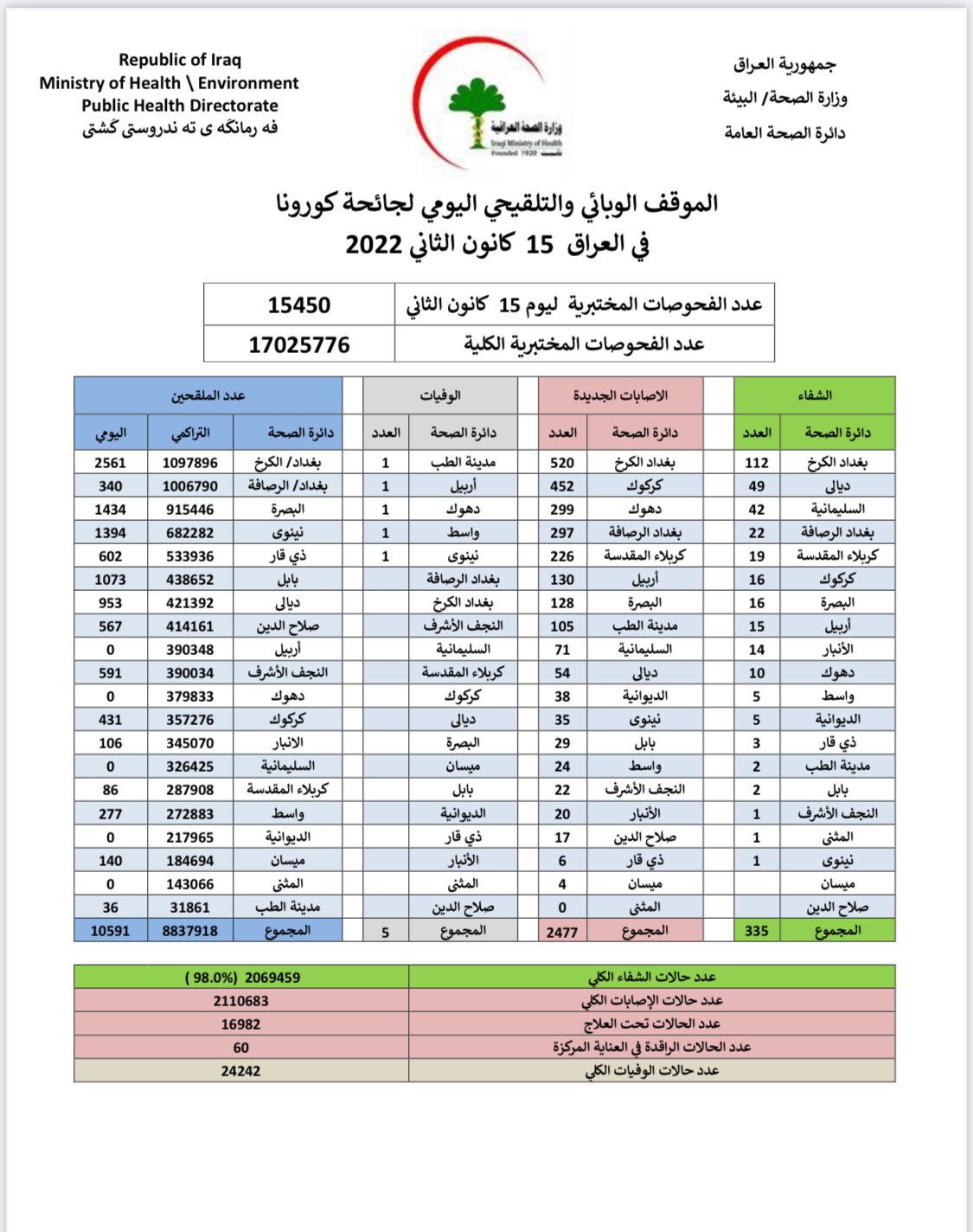 أعلنت وزارة الصحة، اليوم السبت، الموقف الوبائي اليومي لجائحة كورونا في عموم العراق.