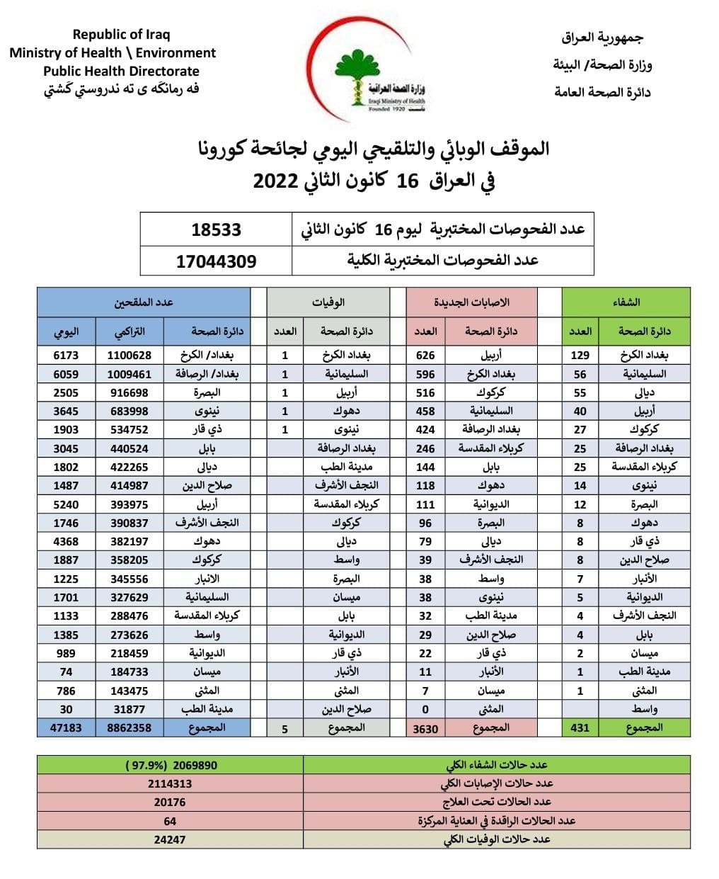 أعلنت وزارة الصحة، اليوم الأحد، الموقف الوبائي والتلقيحي اليومي لجائحة كورونا في عموم العراق.