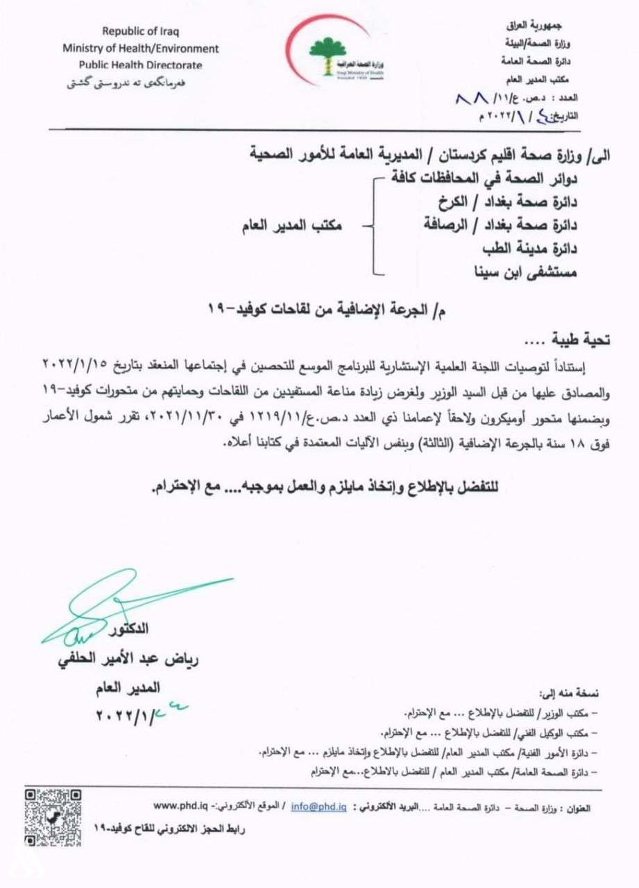 وذكرت الوزارة بحسب وثيقة إنه "لغرض زيادة مناعة المستفيدين من اللقاح وحمايتهم من متحورات كورونا و"اوميكرون"، تقرر شمول الاعمار فوق 18 سنة بالجرعة الاضافية (الثالثة) من لقاح كورونا".