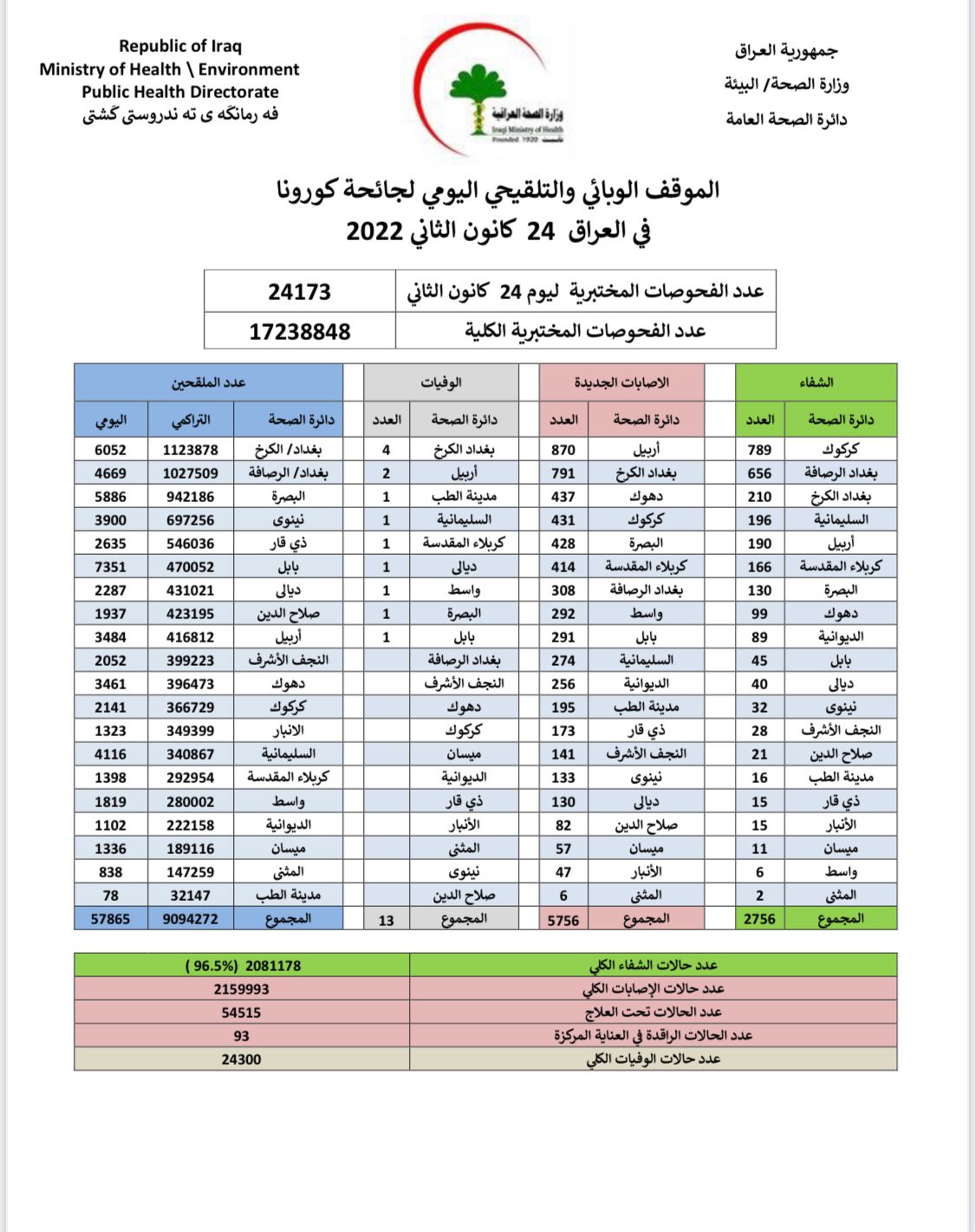 أعلنت وزارة الصحة، اليوم الاثنين، الموقف الوبائي اليومي لجائحة كورونا في العراق.