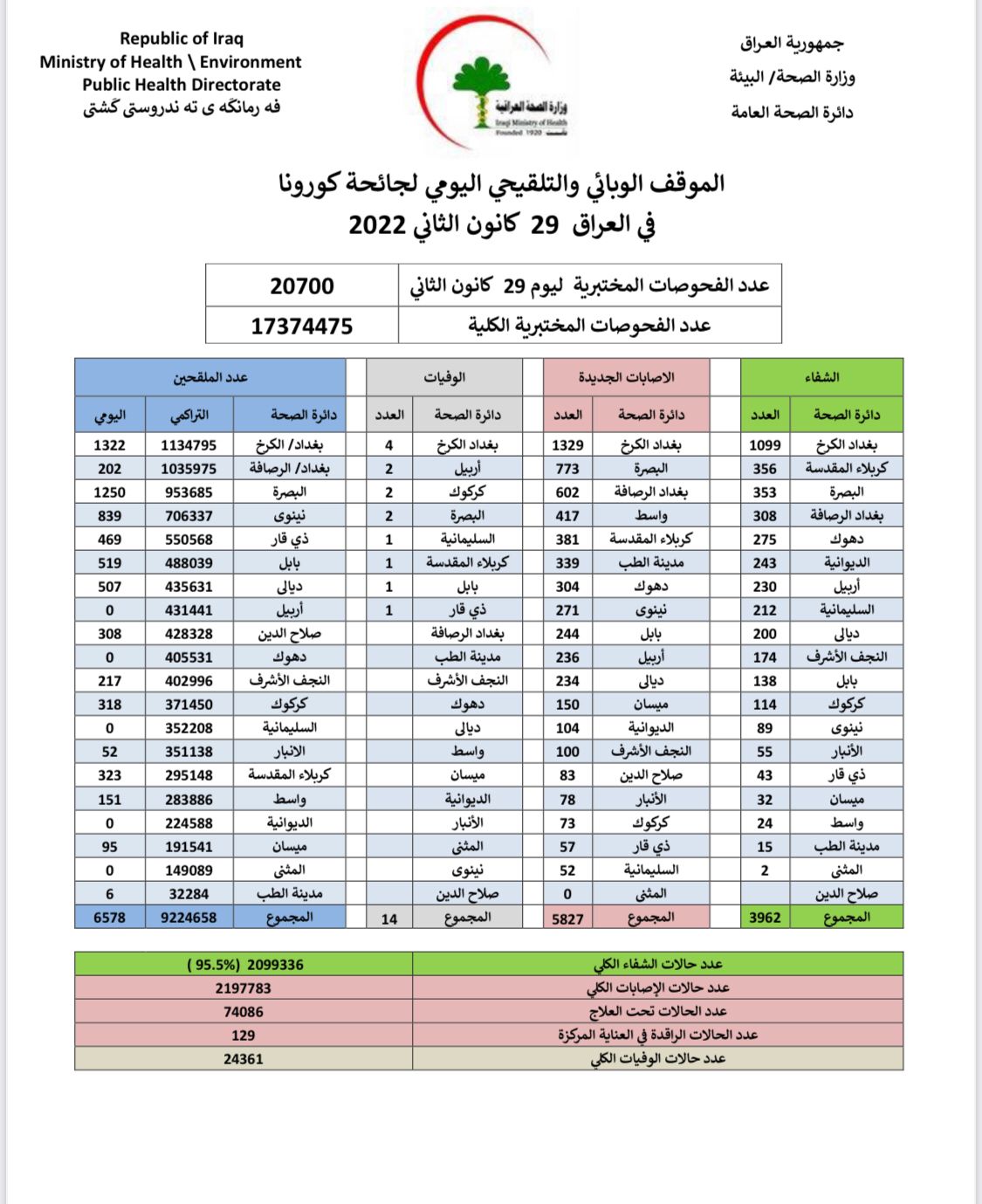 أعلنت وزارة الصحة، اليوم السبت، الموقف الوبائي اليومي لجائحة كورونا في عموم العراق.