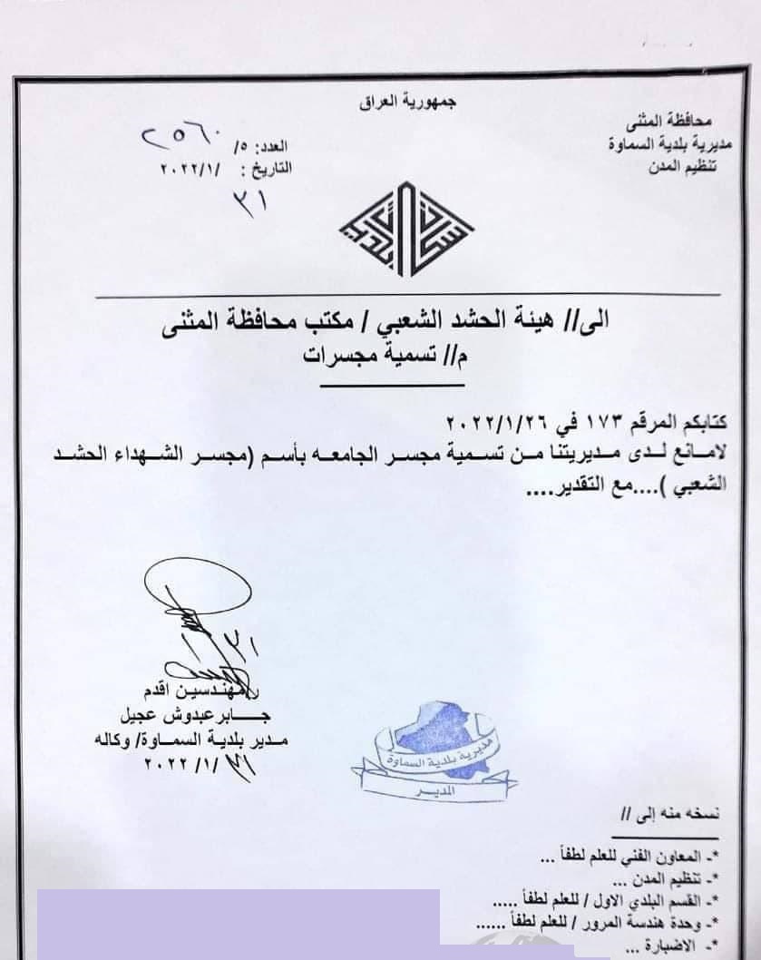 وبحسب وثيقة تمت الموافقة على تسمية مجسر الجامعة باسم مجسر شهداء الحشد الشعبي.