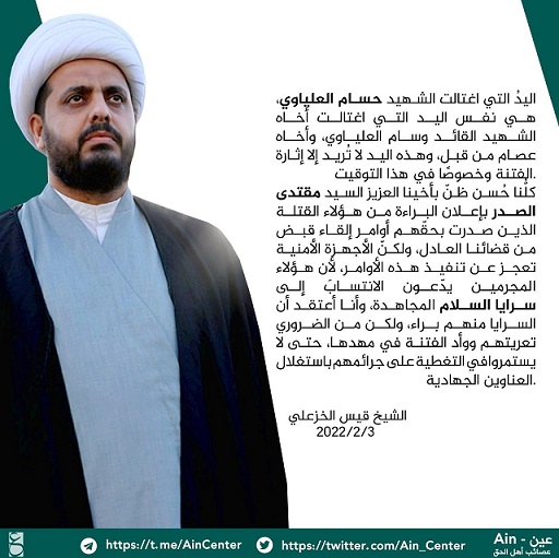 واضاف الخزعلي في تغريدة له على موقع تويتر “كلُّنا حُسن ظنّ بأخينا العزيز السيد مقتدى الصدر بإعلان البراءة من هؤلاء القتلة الذين صدرت بحقّهم أوامر إلقاء قبض من قضائنا العادل”.