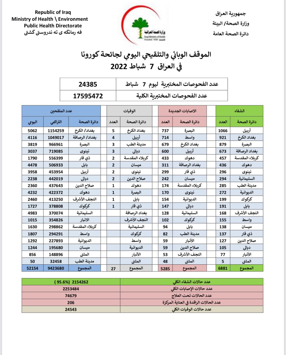 أعلنت وزارة الصحة، اليوم الاثنين، الموقف الوبائي اليومي لجائحة كورونا في العراق.