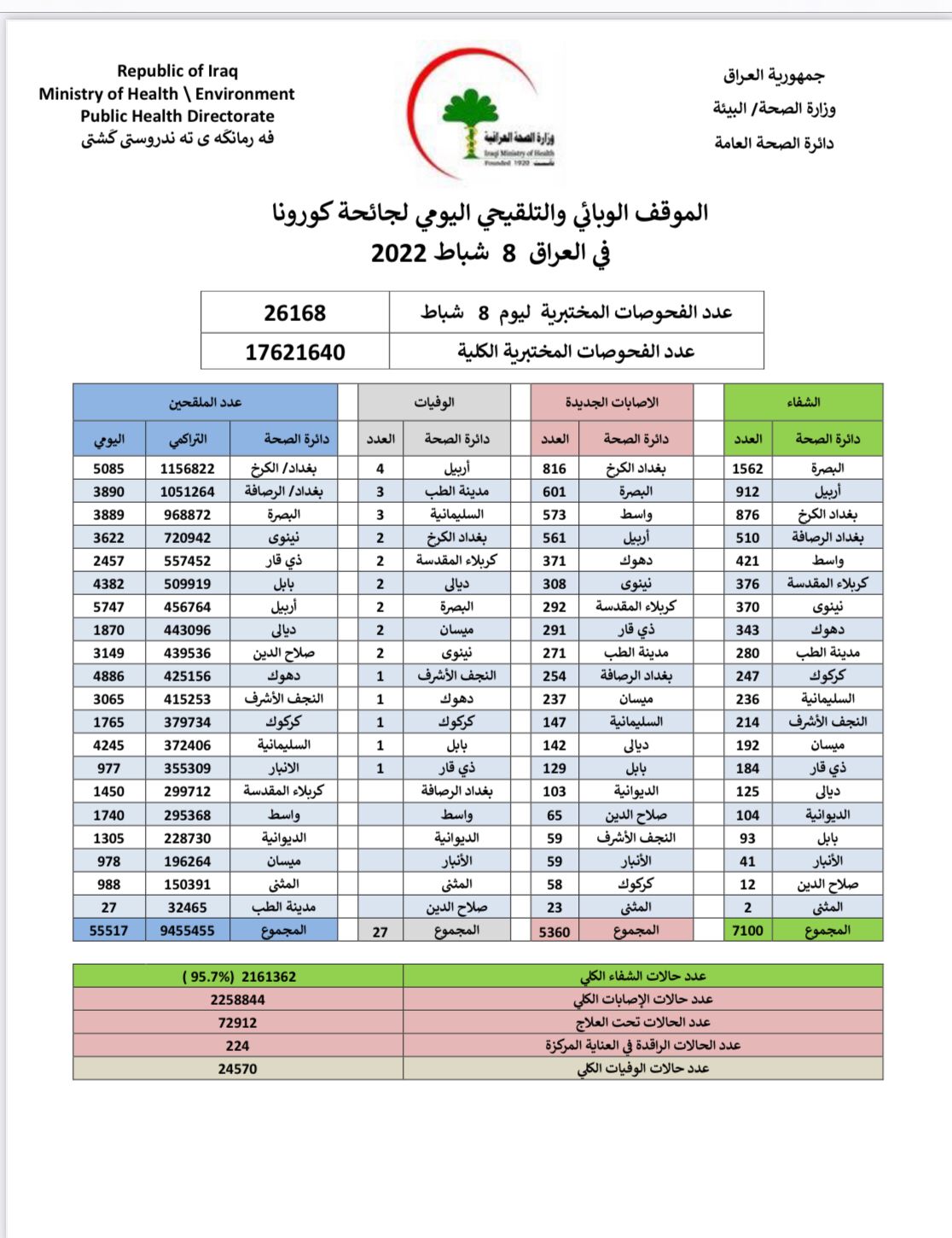 أعلنت وزارة الصحة، اليوم الثلاثاء، الموقف الوبائي اليومي لجائحة كورونا في عموم العراق.