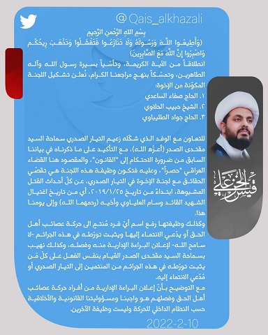 وتابع، "كذلك وظيفتها رفع اسم أيّ فرد مُنتمٍ الى حركة عصائب أهل الحق أو يدّعي الانتماء إليها ويثبت تورّطه في هذه الجرائم -لا سامح الله- لإعلان البراءة الإدارية منه وفصله، وكذلك نهيب بسماحة السيد مقتدى الصدر القيام بنفس الفعل على كلّ مَن يثبت تورّطه في هذه الجرائم من المنتمين إلى التيار الصدري أو مُدّعي الانتماء إليه".