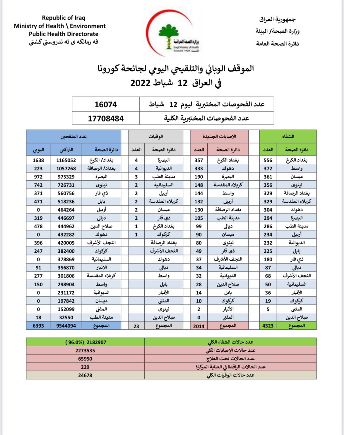 أعلنت وزارة الصحة، اليوم السبت، الموقف الوبائي اليومي لجائحة كورونا في عموم العراق.