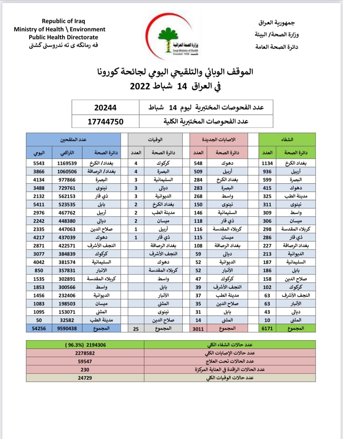 أعلنت وزارة الصحة، اليوم الاثنين، الموقف الوبائي اليومي لجائحة كورونا في عموم العراق.