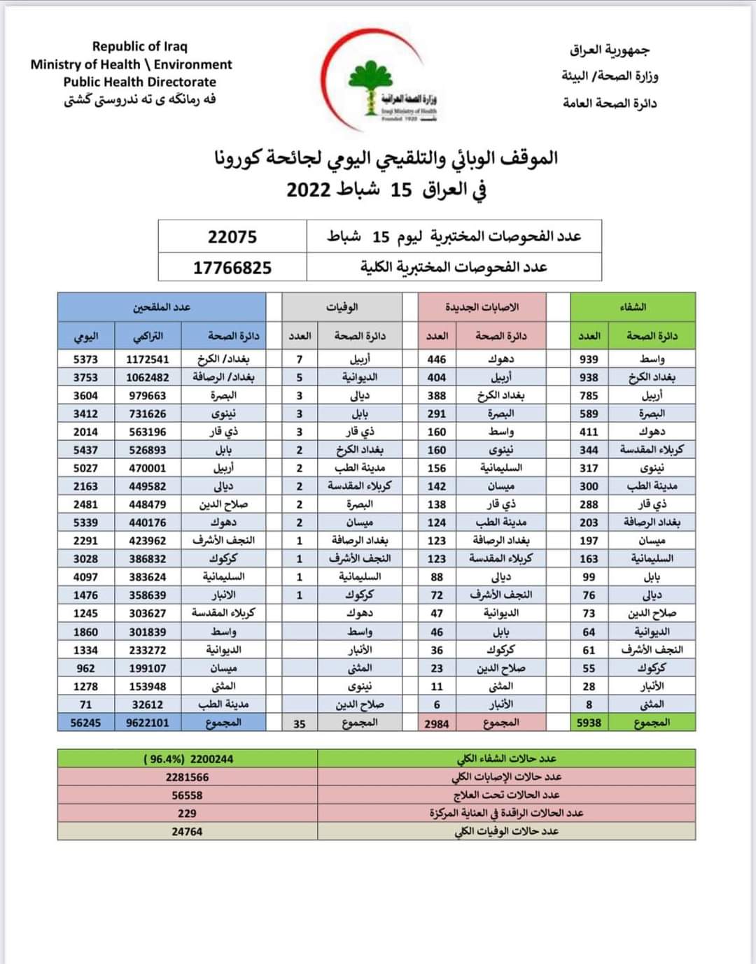 أعلنت وزارة الصحة، اليوم الثلاثاء، الموقف الوبائي اليومي لجائحة كورونا في العراق.