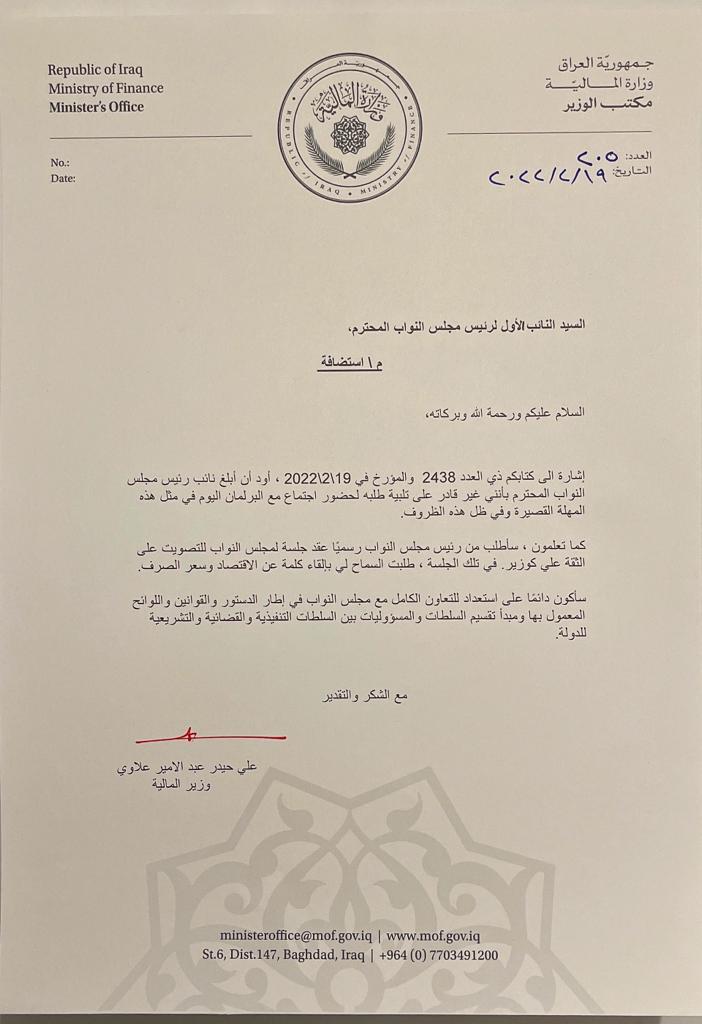 طالب وزير المالية، علي عبد الأمير علاوي، اليوم السبت، رئيس مجلس النواب، بعقد جلسة للمجلس للتصويت على الثقة عليه كوزير، فيما طلب السماح له بإلقاء كلمة عن الاقتصاد وسعر الصرف.