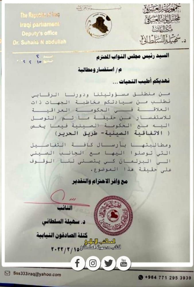 وجهت النائب عن كتلة الصادقون النيابية سهيلة السلطاني، الجمعة، استفساراً رسمياً لرئاسة مجلس النواب العراقي تدعو فيه للكشف عن اخر تطورات الاتفاقية الصينية و طريق الحرير.