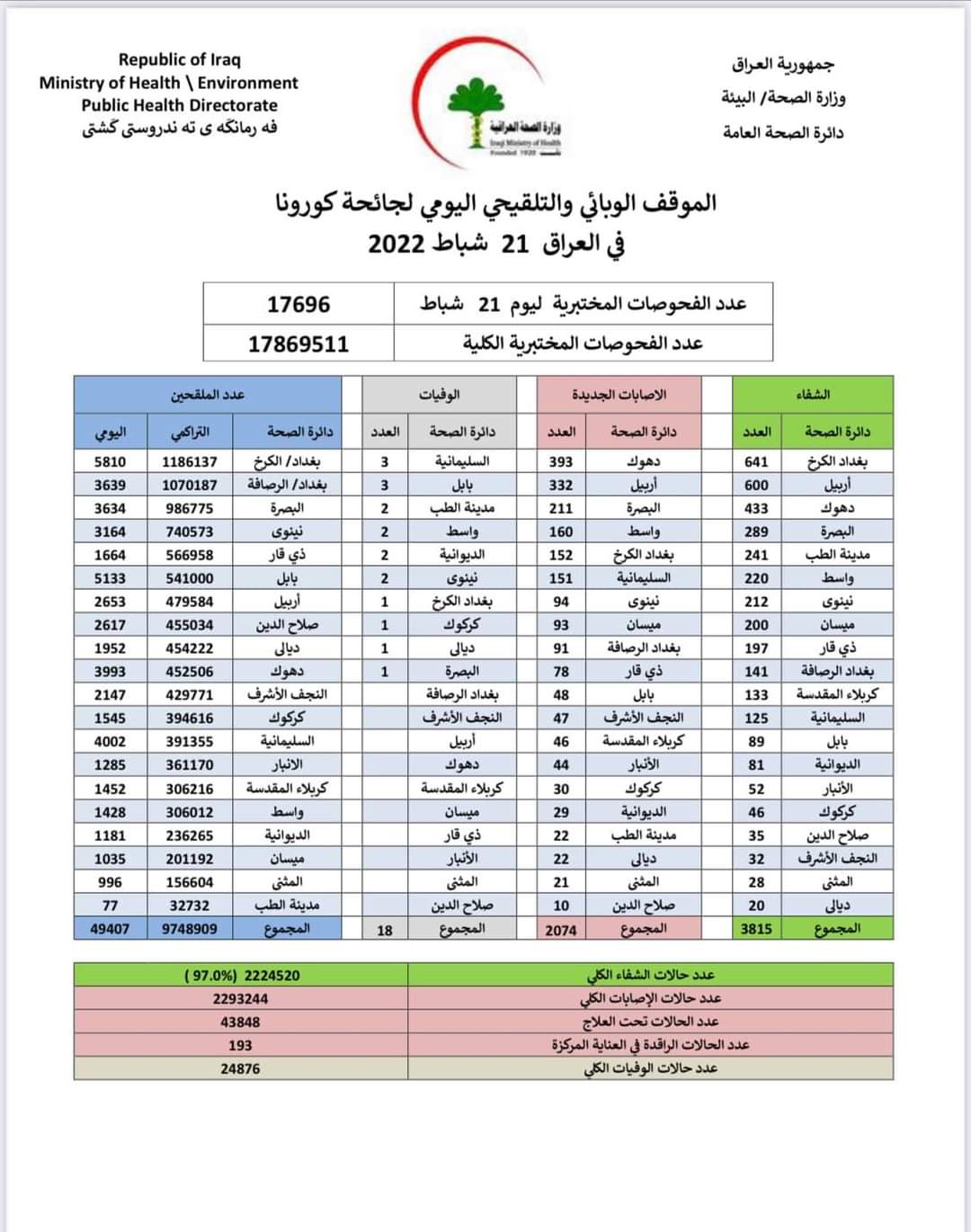 أعلنت وزارة الصحة، اليوم الاثنين، الموقف الوبائي اليومي لجائحة كورونا في عموم العراق.
