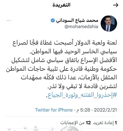 وقال السوداني في تغريدة على تويتر ان “الأفضل الإسراع باتفاق سياسي شامل لتشكيل حكومة وطنية قادرة على تلبية حاجات المواطن المثقل بالأزمات”.