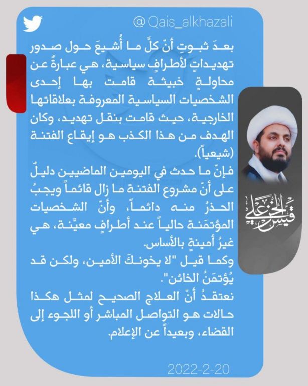 في تغريدة له : الشيخ قيس الخزعلي يتحدث عن شخصية سياسية نقلت تهديداً لإيقاع الفتنة "شيعياً"