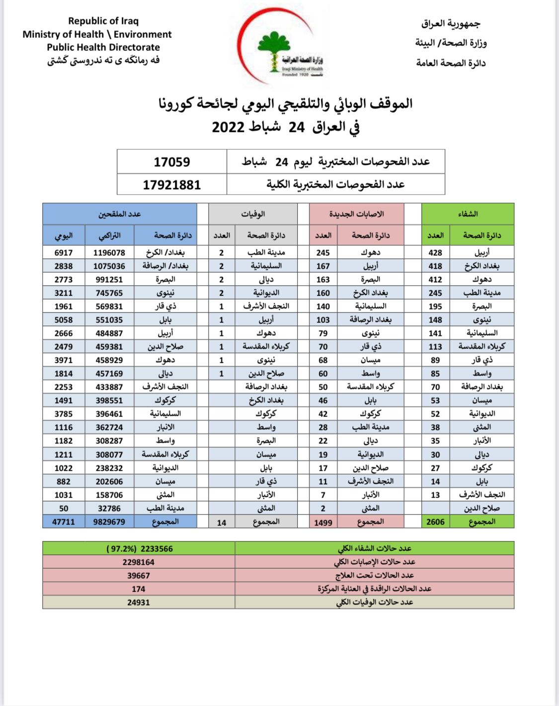 أعلنت وزارة الصحة، اليوم الخميس، الموقف الوبائي اليومي لجائحة كورونا في العراق.