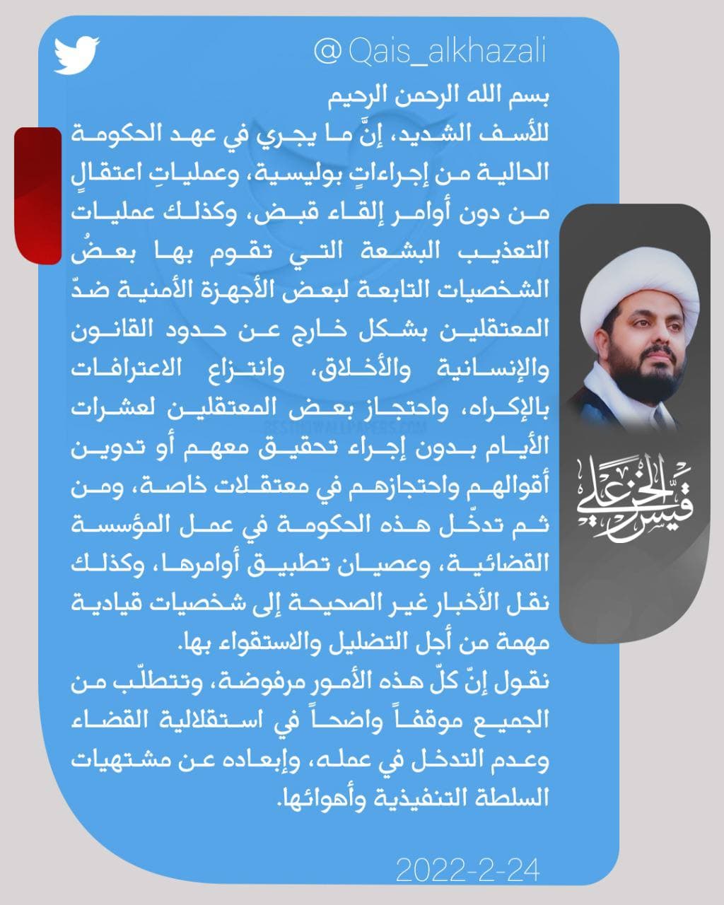 الشيخ قيس الخزعلي في تغريدة له ينتقد التدخلات في عمل القضاء