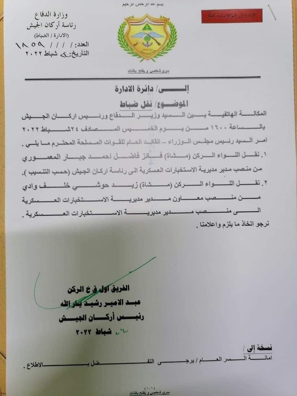 وتضمنت الوثيقة تسمية اللواء الركن زيد حوشي خلف في منصب مدير الاستخبارات العسكرية.