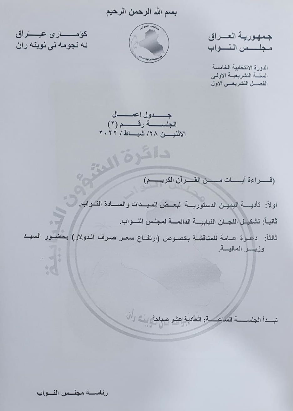 وتضمن جدول الأعمال "تأدية اليمين الدستورية لبعض النواب فضلاً عن تشكيل اللجان النيابية الدائمة لمجلس النواب بالإضافة الى دعوة عامة لمناقشة ارتفاع أسعار صرف الدولار بحضور وزير المالية".