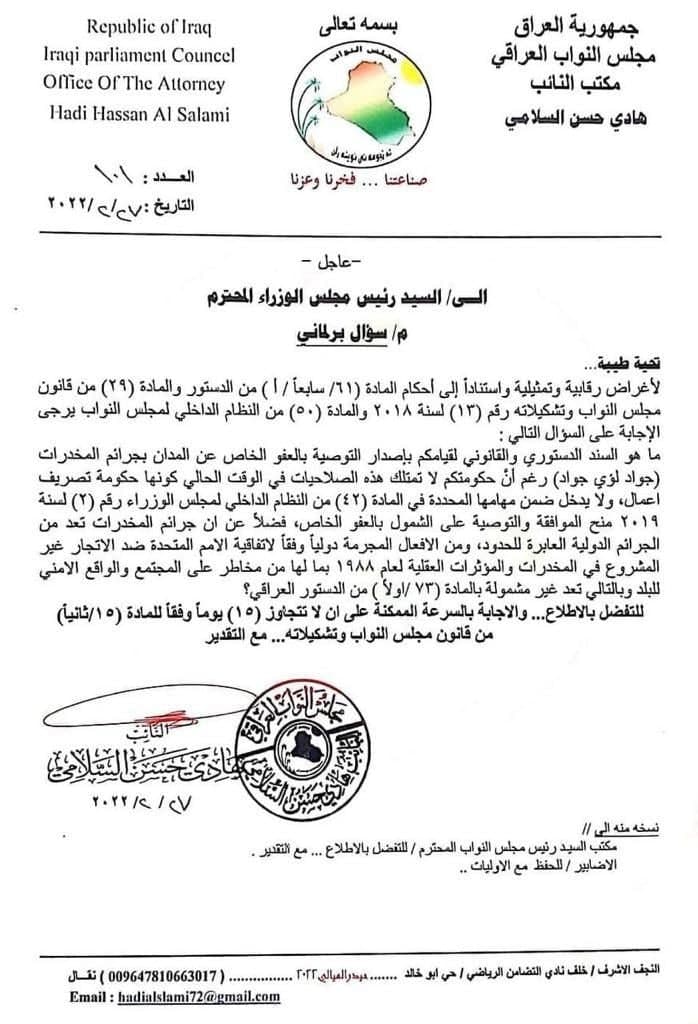 وطالب السلامي الكاظمي بحسب وثيقة، بـ”توضيح السند الدستوري، و القانوني بإصدار الأخير التوصية بالعفو الخاص عن المدان بجرائم المخدرات (جواد لؤي جواد) رغم ان حكومته لا تمتلك هذه الصلاحيات في الوقت الحالي كونها حكومة تصريف اعمال”.