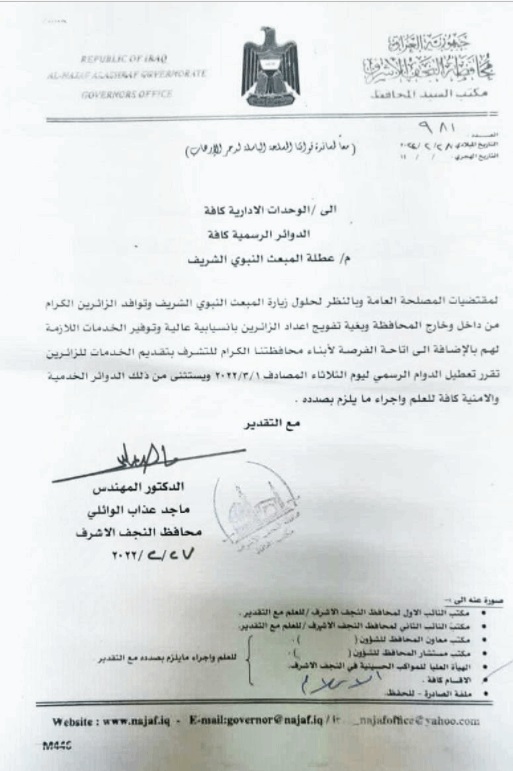 وبحسب وثيقة ، "قرر محافظ النجف ماجد الوائلي تعطيل الدوام الرسمي في المحافظة ليوم غد الثلاثاء بمناسبة زيارة المبعث النبوي الشريف".