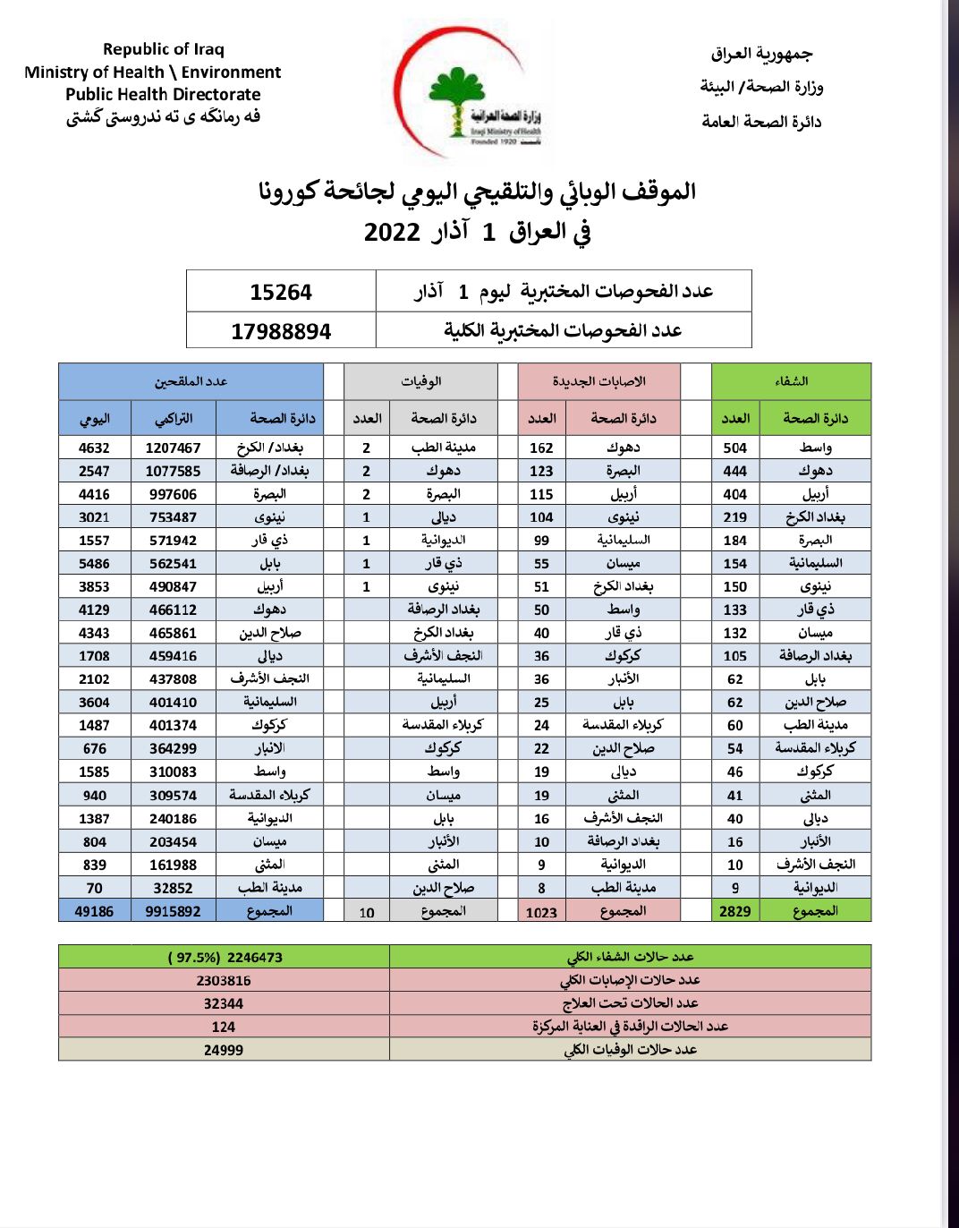أعلنت وزارة الصحة، اليوم الثلاثاء، الموقف الوبائي اليومي لجائحة كورونا في عموم العراق.