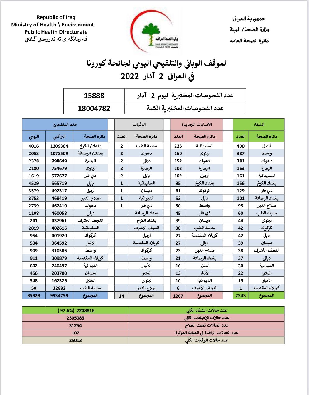 أعلنت وزارة الصحة، اليوم الأربعاء، الموقف الوبائي اليومي لجائحة كورونا في عموم العراق.