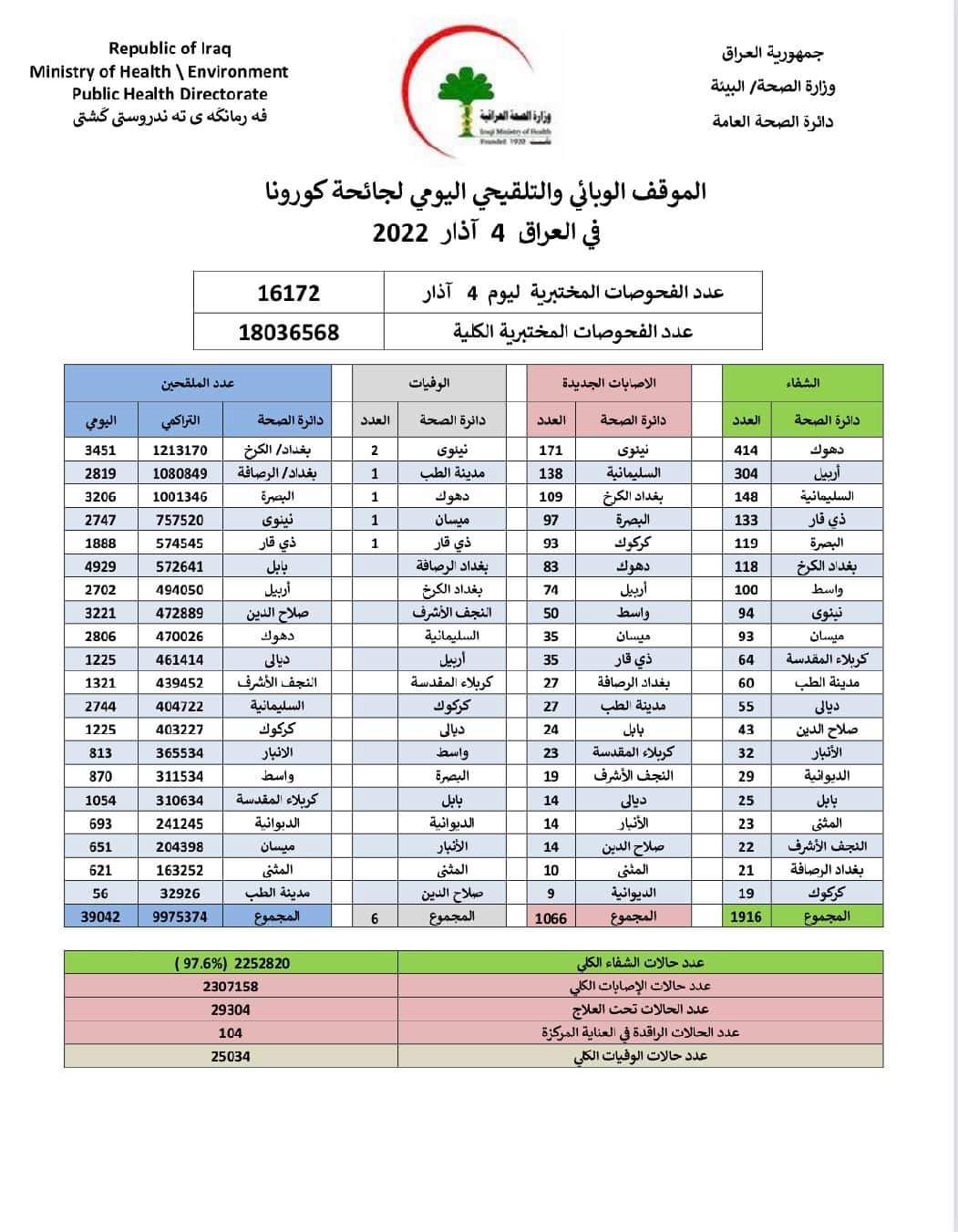 أعلنت وزارة الصحة، اليوم الجمعة، الموقف الوبائي اليومي لجائحة كورونا في عموم العراق.