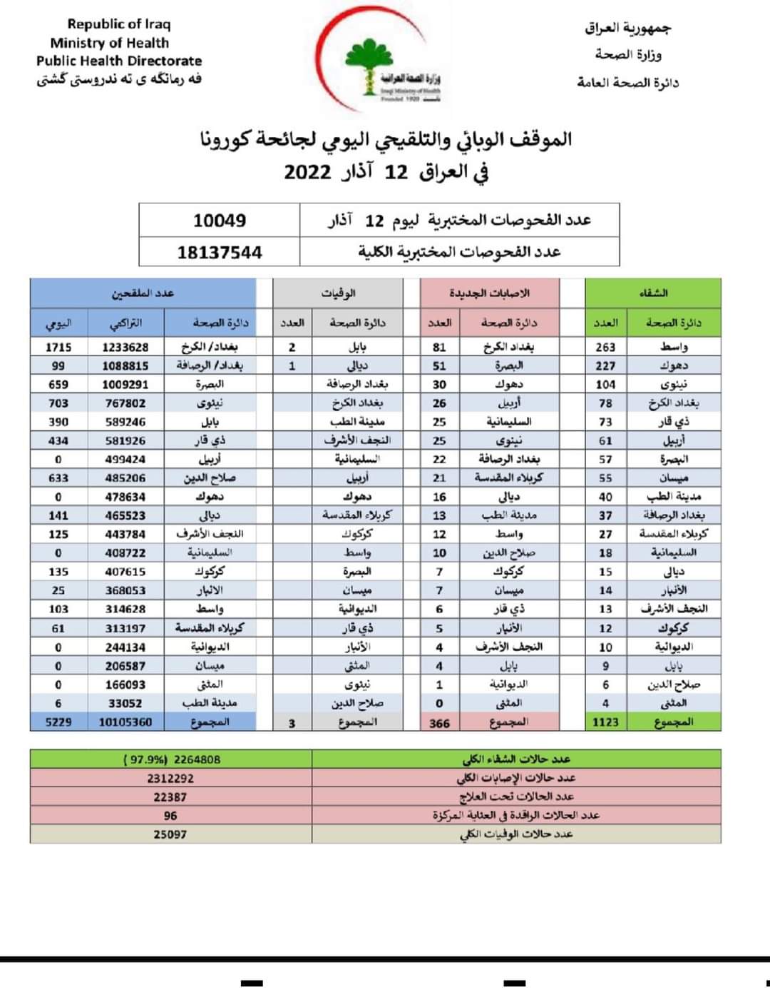 أعلنت وزارة الصحة، اليوم السبت، الموقف الوبائي اليومي لجائحة كورونا في عموم العراق.