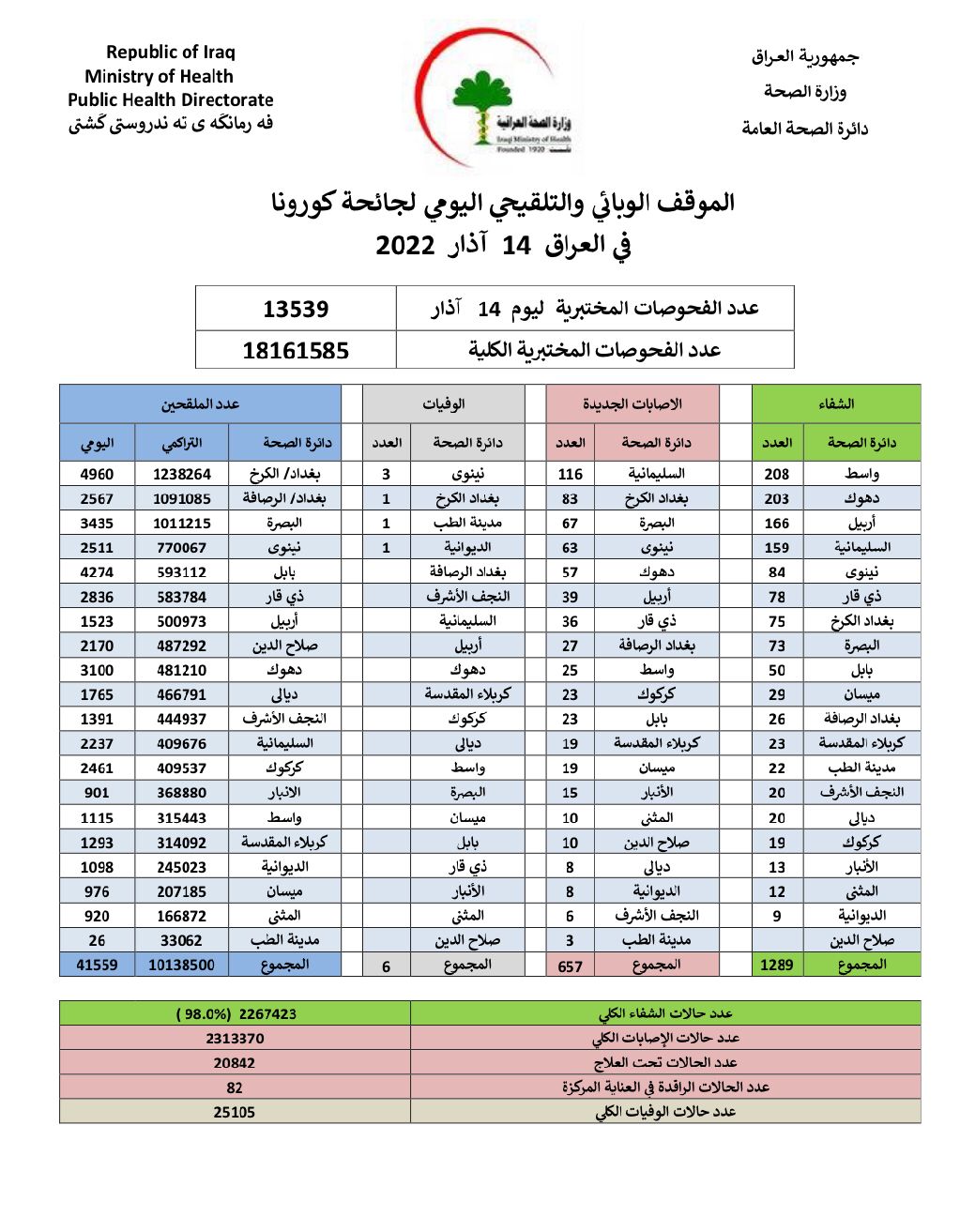 أعلنت وزارة الصحة، اليوم الاثنين، الموقف الوبائي اليومي لجائحة كورونا في عموم العراق.