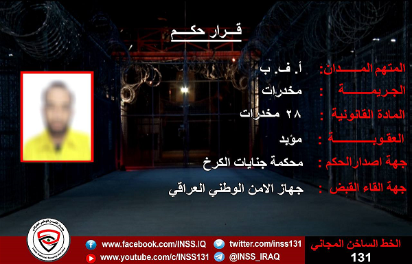 وقال جهاز الامن الوطني في بيان مقتضب ان "محكمة جنايات الكرخ، اصدرت حكماً بالسجن المؤبد على احد تجار المخدرات في العاصمة بغداد".