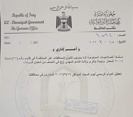 وبحسب وثيقة ، حملت توقيع الشعلان، تقرر تعطيل الدوام الرسمي ليوم السبت المقبل الموافق 19 آذار، للمدارس، بذكرى ولادة الإمام المهدي (عج).