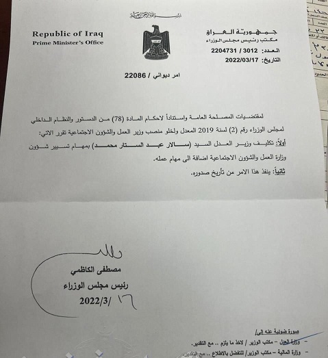 اولا: تكليف وزير العدل سالار عبدالستار محمد بمهام تسيير شؤون وزارة العمل والشؤون الاجتماعية اضافة إلى مهام عمله.