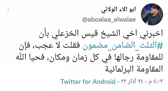 وقال الولائي في تغريدة على تويتر، إنه “اخبرني اخي الشيخ قيس الخزعلي بأن الثلث الضامن مضمون فقلت لا عجب، فإن للمقاومة رجالها في كل زمان ومكان”.